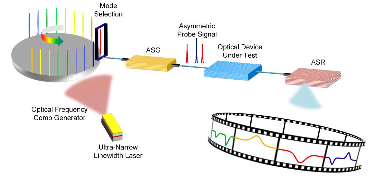 最近,我校潘时龙教授团队针对上述问题提出了一种基于非对称光双边带发射机与接收机的光矢量分析方法,能够同时满足超宽带、超高分辨率和超大动态范围的测量要求。非对称光双边带的使用不仅使测量范围加倍,避免出现频谱混叠,还消除了调制非线性带来的测量误差。接收机的高边带抑制比有助于实现大动态范围。由于发射机和接收机具有波长独立性,结合光频梳技术后,可将测量范围拓展至1THz以上,而无需进行复杂的操作和控制。在实验中,实现了分辨率为334 Hz、动态范围大于 90 dB、测量范围为1.075 THz的光器件光谱响应的测量。