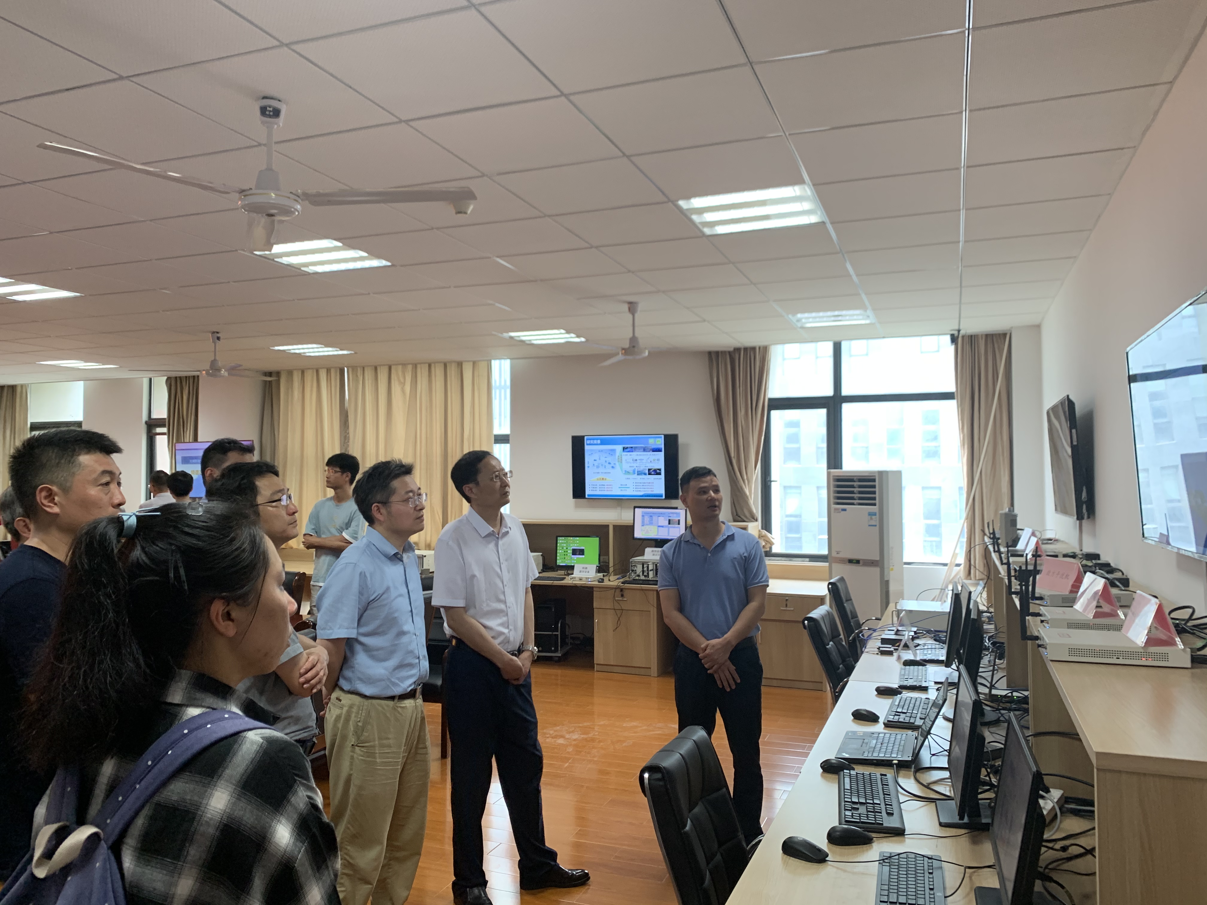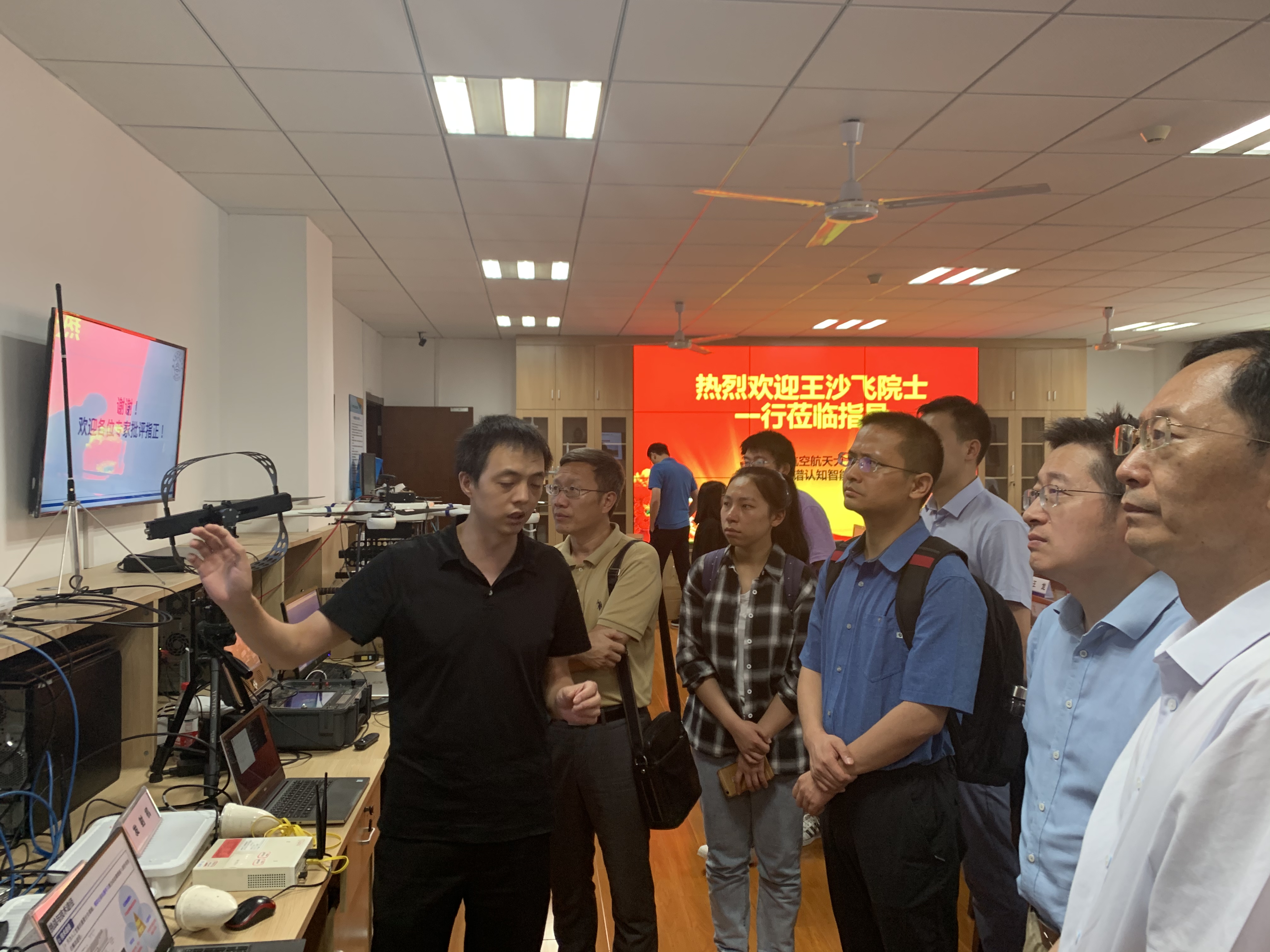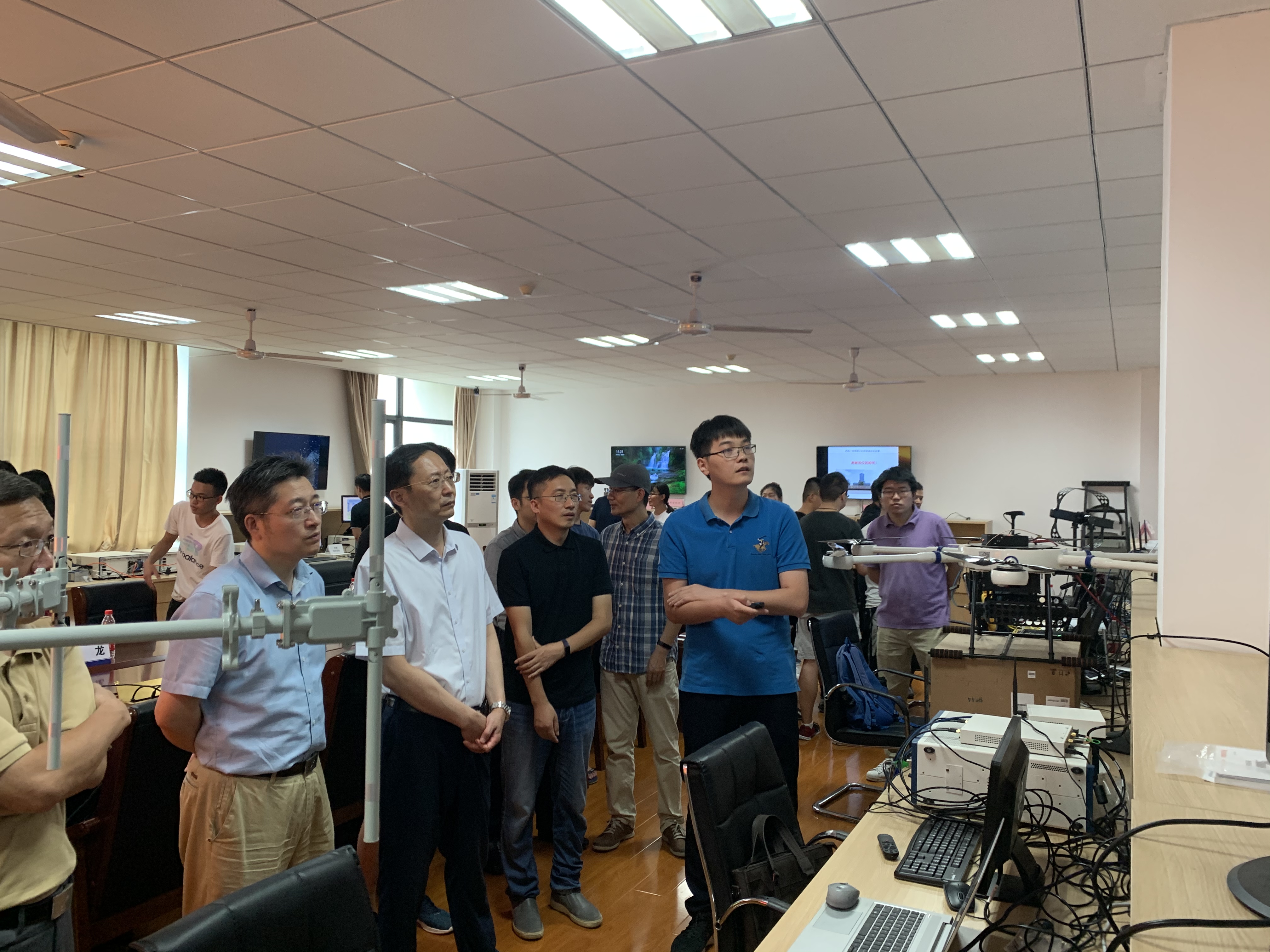 随后,王沙飞院士一行人观摩了实验室承担的国家自然科学基金重大91直播仪器研制项目“无人机频谱认知仪器研制”以及国家自然科学基金重点项目“大规模无人机集群智能自组网理论与关键技术”的现场演示。