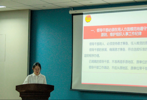 院团委副书记、团支部成员张楚欣同学领学1986年中共中央《关于严格按照党的原则选拔任用干部的通知》。