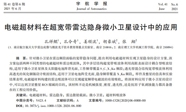 神舟十二号载人飞船发射之际,我院电磁隐身与超材料应用课题组也将“电磁超材料在超宽带雷达隐身微小卫星设计中的应用”这一91直播 成果发表在《宇航学报》上,课题组设计的两款电磁超构隐身材料成功应用于微小卫星的设计中,实现卫星整星RCS缩减的目的,在机械强度、密度、透光性,抗原子氧剥蚀能力方面均具备工程应用价值。目前,该91直播 成果在航天八院的部署下,处于在轨整星实验验证阶段。