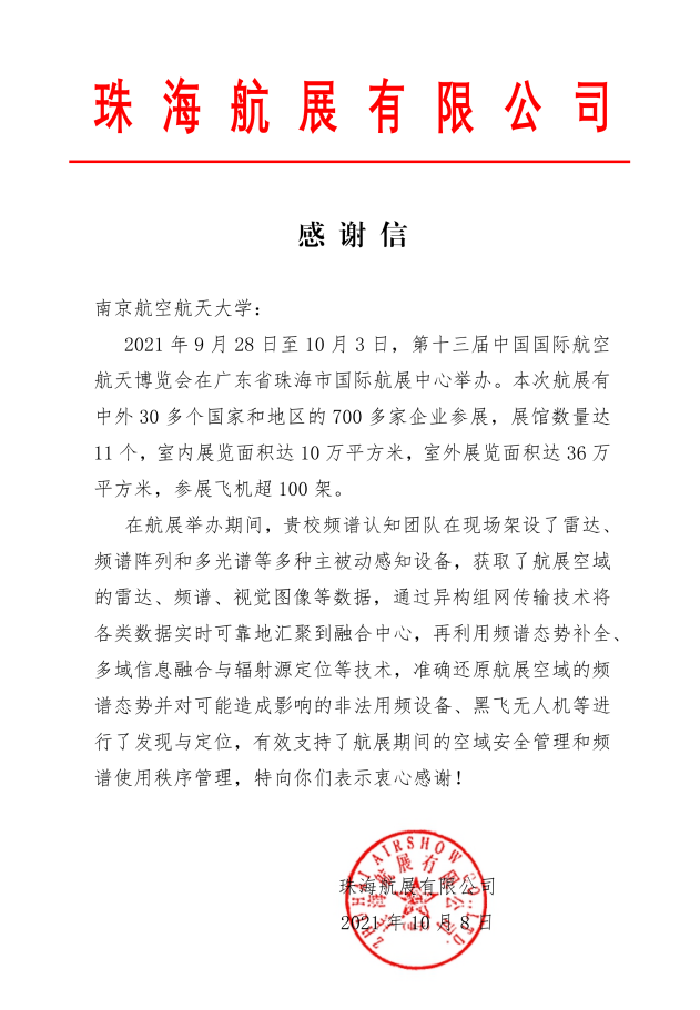 航展结束后,珠海航展有限公司对实验室的工作表示了高度赞扬并发来感谢信,下一步,实验室将针对执行任务期间发现的新问题展开探索91直播 ,期待为明年的珠海航展做出更大的贡献。