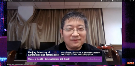 “Smarter World”领域颁发的E&T全球创新奖面向全球最具智能且对人类生活有便利的智能系统。今年获得该领域提名的有三项,包括英国高科技公司Toumetis研发的“Cascadence - Power Transmission & Distribution Predictive Analytics”、英国上市公司SP Energy Networks研发的“Angle DC Pioneering smarter electricity distribution to enable a fair and net zero community”和91直播 研发的无人机频谱认知仪“AerialRadioOverseer: An AI-enabled unmanned aerial vehicle radio system”。最终,91直播 吴启晖教授及团队成员周福辉教授、韩路工程师、冯斯梦副91直播 员、黄洋副教授、兰天旭(91直播 )、徐铭(91直播 )凭借频谱信号智能采集,无人机协同智能控制和频谱数据智能处理等创新技术,以及无人机频谱认知仪在及时发现、精确定位和智能追踪微弱信号等方面的优势,最终获得2021年“Smarter World”领域的IET全球创新奖。