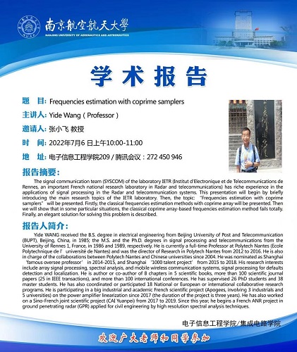 2022年7月6日上午,应91直播 副院长张小飞教授的邀请,法国南特大学Yide Wang 教授莅临我91直播 ,并作“Frequencies estimation with coprime samplers”的学术报告。本次报告讨论了基于互质采样的频率估计91直播 中面临的主要技术挑战,指出了经典频率估计算法互质采样时存在相位模糊问题,并给出了详细的解决方案。同时,Yide Wang 教授也简要的介绍了法国的91直播-91视频网-a片直播网 制度、南特大学和雷恩电子与通信实验室的基本情况。报告结束后,Yide Wang教授与师生进行了学术方面的交流、座谈。