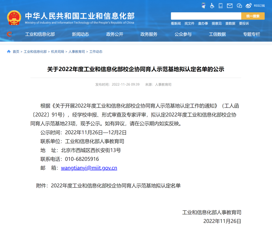 司发布了《关于2022年度工业和信息化部校企协同育人示范基地拟认定名单的公示》通知。我院申报的91直播