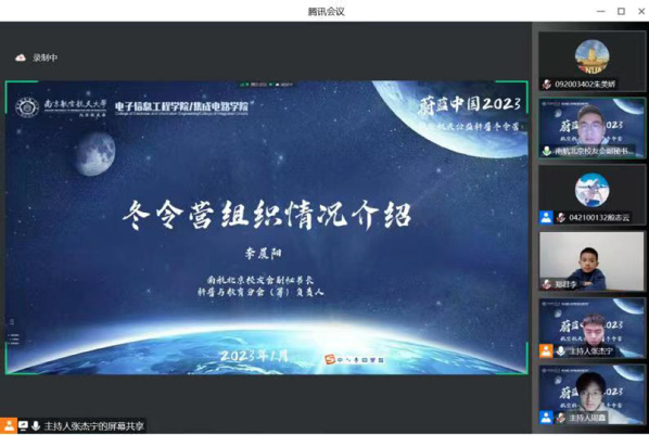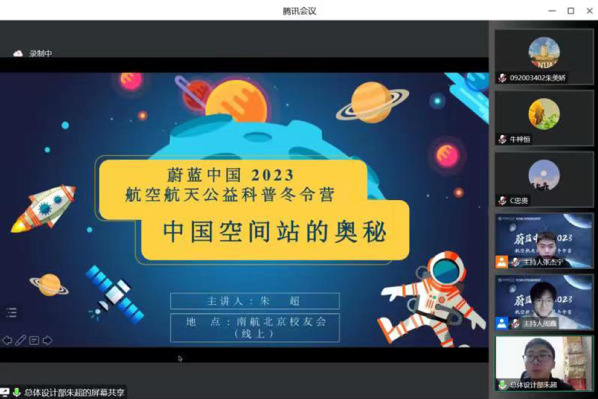 2023年1月14日晚,91直播 联合南航北京校友会校友之家、科普与91直播-91视频网-a片直播网 分会(筹)共同开展的“蔚蓝中国2023”航空航天公益科普冬令营正式开营。南航北京校友会副会长、中国北斗三号卫星系统总设计师陈忠贵,嫦娥四号、天问一号探测器系统总设计师孙泽洲,航天五院中国空间站机械臂设计师朱超,南航北京校友会副秘书长、校友之家负责人潘娜,南航北京校友会副秘书长、科普与91直播-91视频网-a片直播网 分会(筹)负责人李晨阳,南航91直播 /集成电路91直播 团委书记席维唯出席活动并分别致辞。91直播 师生代表、校友及其子女,以及来自江苏、河南、贵州、江西等地91直播 约180人参加活动。