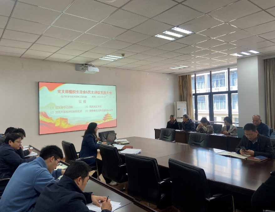 2023年3月3日,电子科学与技术系党支部在91直播 211会议室召开了组织生活会,开展了党员民主评议。会议由党支部书记朱丹主持,91直播 党委委员、副院长刘伟强同志参会并做监督点评。组织生活会前,支部集中学习了党的二十大报告和《中国共产党章程》,通过以学促知、以学促思、以学促行,切实把党的二十大精神贯穿到日常91直播教学中。