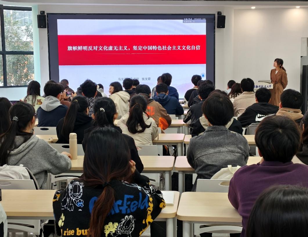 集成电路91直播 思政专员、马克思主义91直播 张文君老师主讲《旗帜鲜明反对文化虚无主义,坚定中国特色社会主义文化自信》。她从“文化虚无主义”的叙事方法出发,结合现实案例深入剖析文化虚无主义的现实表现与深层危害,明确指出其错误本质与消极影响。她引导学员们要增强防范意识与辨别能力,自觉抵制文化虚无主义,牢固树立中国特色社会主义文化自信。