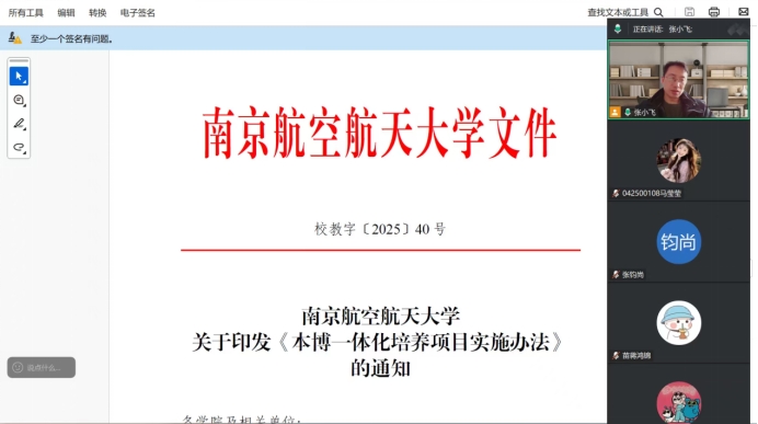 会上,张小飞围绕学校新近印发的《本博一体化培养项目实施办法》(校教字〔2025〕40号)文件核心内容,结合电子信息学科特色,从项目定位、培养模式、考核标准、导师制度和政策保障等关键板块展开详细解读,重点阐释了“3+1+X”的一体化培养体系;针对91直播 高度关注的考核调整机制,详细解读了本科学籍阶段学年综合考核的具体要求,引导91直播 树立清晰的学业奋斗方向。